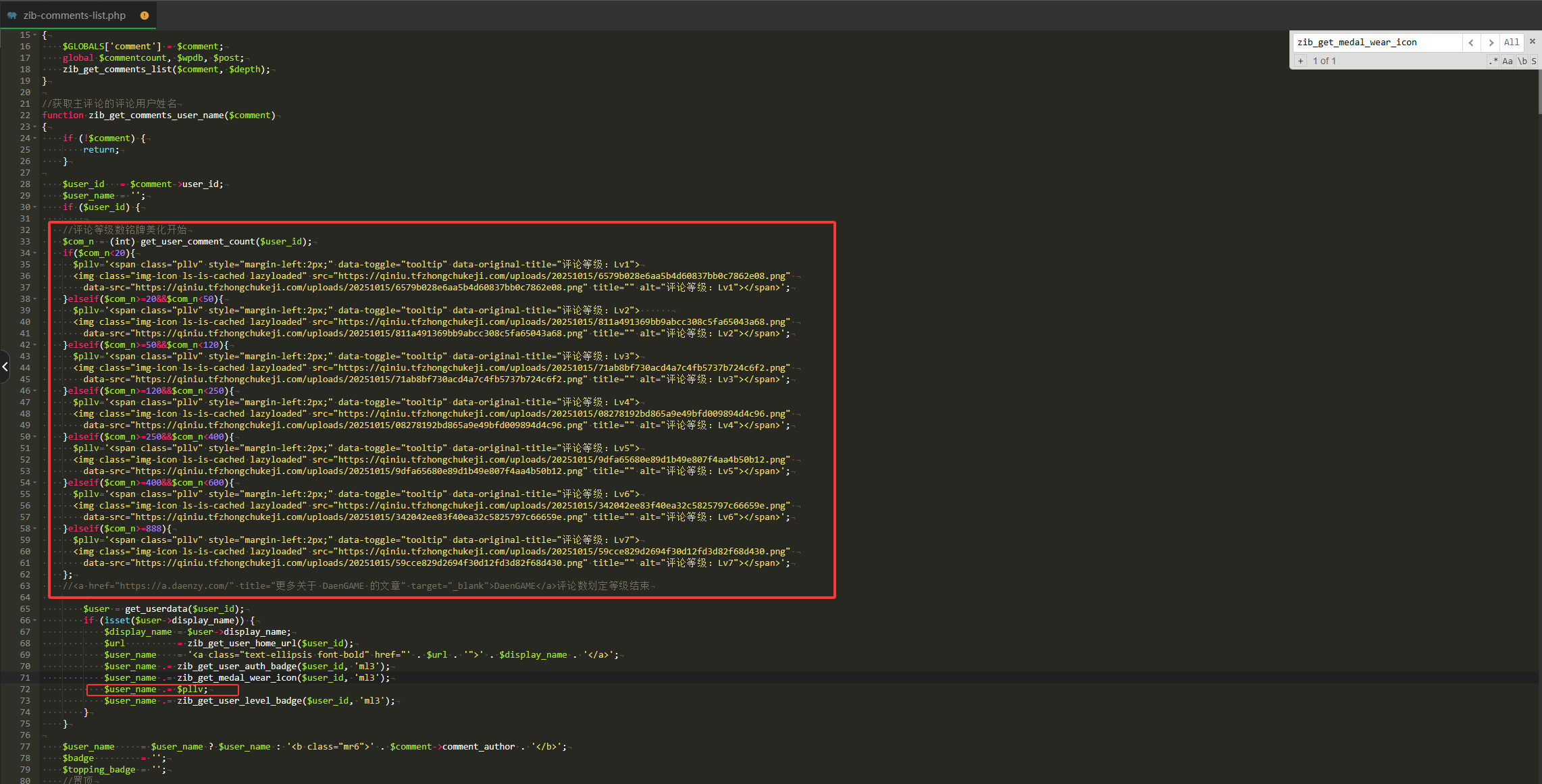 第一步完成后,接着搜索代码 zib_get_medal_wear_icon 在下一行如上图所示第二红框处添加如下代码即可。